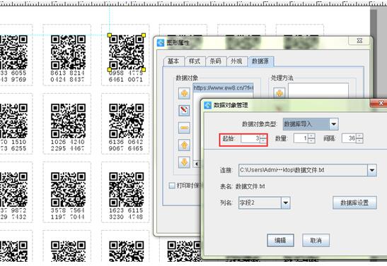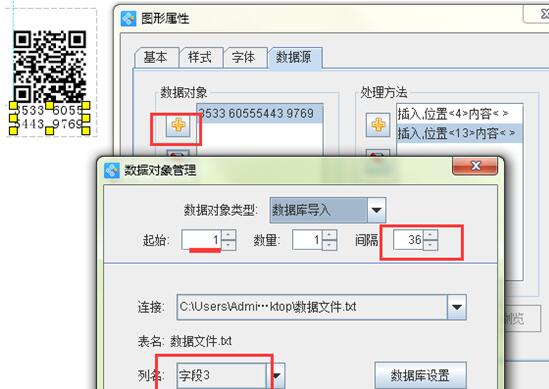 起始是指這個二維碼調用txt文本數據,從第幾行起,這里輸入1;間隔是指:標簽上同樣位置的二維碼或其他對象,第一個標簽和第二個標簽之間間隔多少個數據。一般輸入一組套標中所有小標簽數量,比如36。然后在軟件數據對象窗口下,“列名”中選擇二維碼數據列“字段2”,完成二維碼設置。