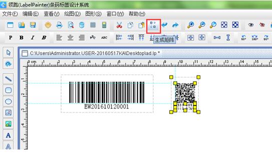 在軟件左側工具欄中點擊“繪制二維碼“圖標按鈕,添加一個二維碼對象。在二維碼上右擊-屬性或雙擊,彈出“圖形屬性”窗口,在“基本”選項卡下,可以直接輸入二維碼尺寸13mm。