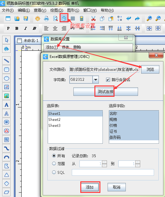 2.數據庫導入(即珠寶清單),點擊窗口上方的柱型“數據庫設置”按鈕,添加excel數據源(珠寶清單為excel表格),“瀏覽”并添加文件后,點擊“測試連接”按鈕,然后“添加”即可。