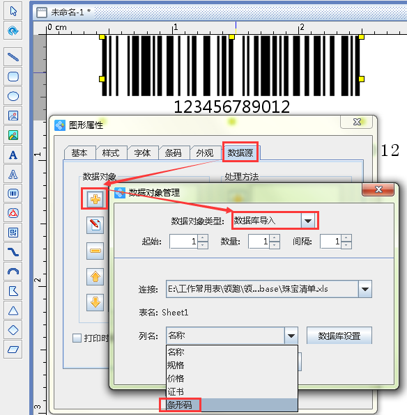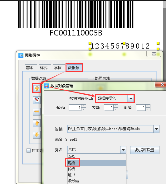 3.2雙擊條形碼,出現圖形屬性窗口,選擇“數據源”,點擊左側的“-”按鈕,刪除原有數據,然后點擊黃色“+”按鈕,添加新的數據,數據對象類型選擇“數據庫導入”,列名選擇“條形碼”,添加即可(如下圖1所示);雙擊普通文本以相同的方法,添加文本數據庫,列名選擇“規格”即可(下圖2所示),第一部分的內容做好了。