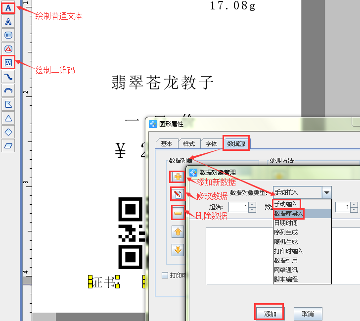 5.1繪制一個二維碼和一個普通文本,然后雙擊二維碼,出現圖形屬性窗口,選擇“數據源”,點擊左側的“-”按鈕,刪除原有數據,然后點擊黃色“+”按鈕,添加新的數據,數據對象類型選擇“數據庫導入”,列名選擇“證書”即可(證書編號作為二維碼編號使用)。雙擊普通文本,出現圖形屬性窗口,選擇“數據源”,點擊左側的“-”按鈕,刪除原有數據,然后點擊黃色“+”按鈕,添加新的數據,數據對象類型選擇“手動輸入”,內容中輸入:“證書”,點擊添加,繼續點擊左側的黃色“+”按鈕,選擇“數據庫導入”,列名選擇“證書”即可。第三部分的內容就做好了。得到圖2所示的效果圖。