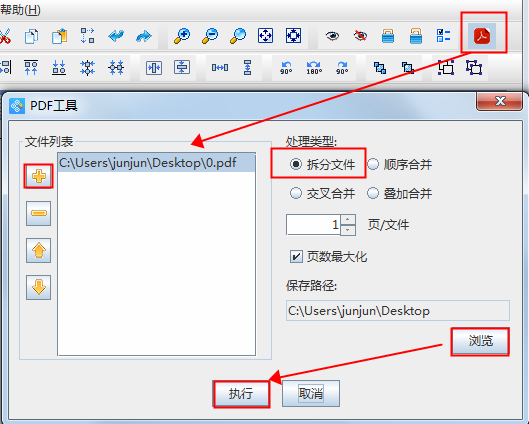 第一種是本身已有的PDF文檔,文檔中含有多頁,想要拆分成一頁為一個文檔,這種的就需要用到軟件右上角紅色按鈕,也就是PDF工具,在彈出的PDF工具窗口中,點擊加號按鈕,找到原PDF文檔所在的文件目錄,添加到PDF工具中,然后點擊右側“處理類型”中的“拆分文件”按鈕,在“頁/文件”選項中,輸入一個PDF文檔中要包含的頁數,設置完成后,選擇保存路徑,執行就可以了。