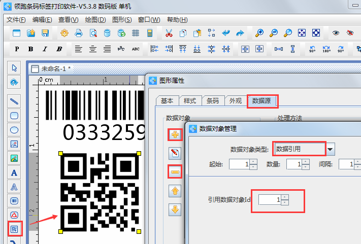 然后再利用左側工具欄的“繪制二維碼”工具,在畫布空白區域拖動鼠標繪制出一個二維碼,雙擊條碼進入屬性窗口,在彈出的窗口中,選擇數據源選項,同上步驟一樣,刪除默認數據后,然后添加新的數據對象,這里選擇數據對象類型為“數據引用”,在彈出的數據對象管理窗口中,輸入需要引用的數據對象的id號,也就是條形碼的圖形ID號,上圖可看到條形碼的圖形ID是1,因此只需要在該窗口輸入引用的id號1,就成功將條形碼的數據引用到二維碼中了。