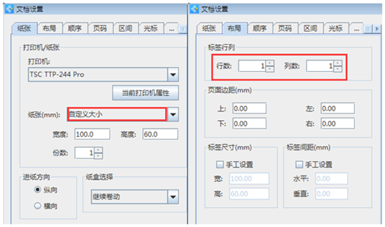 打開中瑯條碼標簽打印軟件,在“文檔設置”—“紙張”選項中,新建自定義紙張,設置好紙張大小,然后選擇“布局”選項,設置標簽行列為1行1列,然后點擊確定。