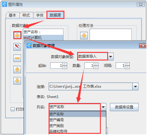 分別雙擊前面繪制好的普通文本、條形碼,在彈出的屬性窗口中,選擇“數據源”選項,同上述操作一樣,刪除默認數據后添加新的數據對象,選擇數據對象類型為“數據庫導入”,在“列名”處選擇相應的列名,然后點擊“添加”按鈕,就成功導入數據庫了。