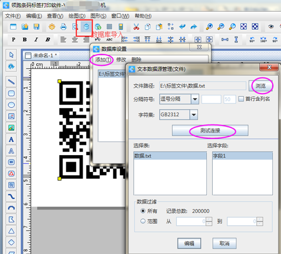 將數據引入中瑯條碼標簽打印軟件后,點擊左側的“繪制二維碼”圖標按鈕,添加二維碼對象。然后在二維碼上右擊-屬性(或雙擊),彈出“圖形屬性”窗口,選擇“數據源”。在“數據對象”欄中刪除默認數據后,點十字添加按鈕,選擇“數據庫導入”引用數據庫中農藥二維碼的內容。