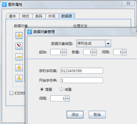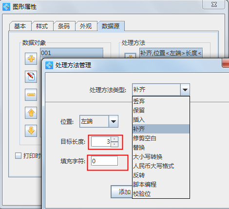 另外也有不少朋友使用序列生成的方式進(jìn)行批量打印,具體方法就是在可變數(shù)據(jù)的數(shù)據(jù)源選項(xiàng)中,添加“數(shù)據(jù)對(duì)象類型”時(shí),選擇“序列生成”,添加好數(shù)據(jù)對(duì)象后,需要再添加一個(gè)“處理方法”,如補(bǔ)齊、插入、丟棄等等,如圖,在選擇“補(bǔ)齊”的處理方法中,設(shè)置目標(biāo)長(zhǎng)度3,填充字符0,就表示序列生成將會(huì)以001、002、003的形式遞增。
