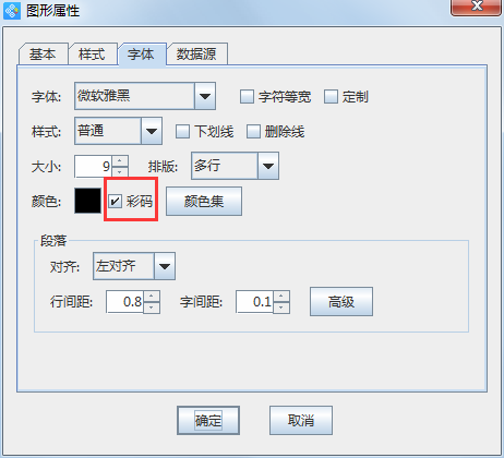 選擇“字體”選項,普通用戶使用最多的就是字體樣式、大小和顏色這些,最重要的是可以設置彩碼,所謂彩碼就是對文本框中的部分或全部文字進行單獨變色,每個文字信息顏色各不相同,要生成彩碼必須在“字體”選項中勾選“彩碼”,彩碼在“數據源”選項中的格式為:文本內容,(英文半角逗號)文本顏色,比如文本內容為10個漢字,要全部設置為彩碼的話數據源選項中的顏色內容就得為10個數據,這10個數據可以是序列生成,隨機生成,也可以通過數據庫導入,如圖所示,就是通過隨機生成的方式添加的顏色碼。